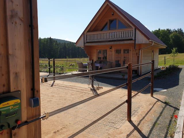 Ganz neue Moeglichkeit fuer Studenten mit Pferd Ein Holzferienhaus voll ausgestattet mit angrenzenden Offenstall Preis 450,-/Monatlich pro Pferd ( Putzplatz,Sattelkammer),Reithalle 20/60, Reitplatz 20/40, Longierhalle 18 m Durchmesser, wunderschoenes Ausreitgebiet, Optimale Verhaeltnisse um zu Studieren und sein Pferd dabei zu haben. Bayreuth 14 km entfernt